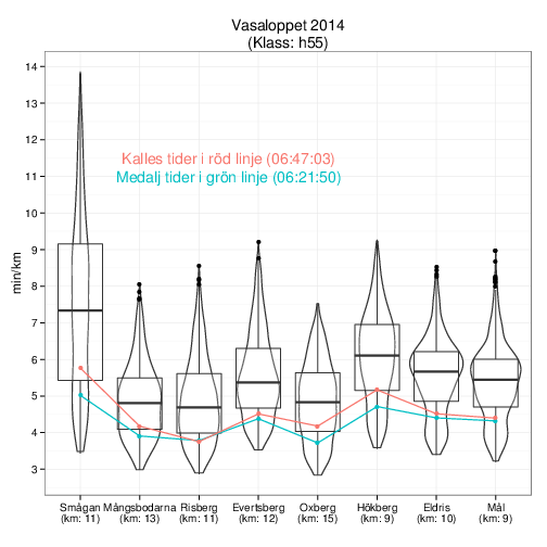 A friend of mine, Kalle, participated in Vasaloppet this year. His time 6:47:03 did not break the medal time at 6:21:50 but he wasn’t that far off either. So I figured I do some analysis to see what is going on. Vasaloppet is 90 km or 56 miles. There are 8 legs of about 9 – 15 km. Each leg goes to a different town, akin to Boston Marathon, which goes from Hopkinton to Ashland to a few other towns and finishes in Boston.